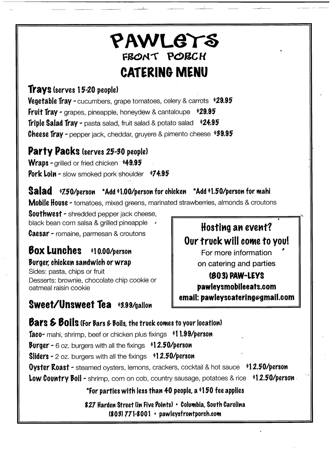 Call 803-PAWLEYS or email us for more information. We cater holidays, tailgating, office parties, birthdays, BBQs...